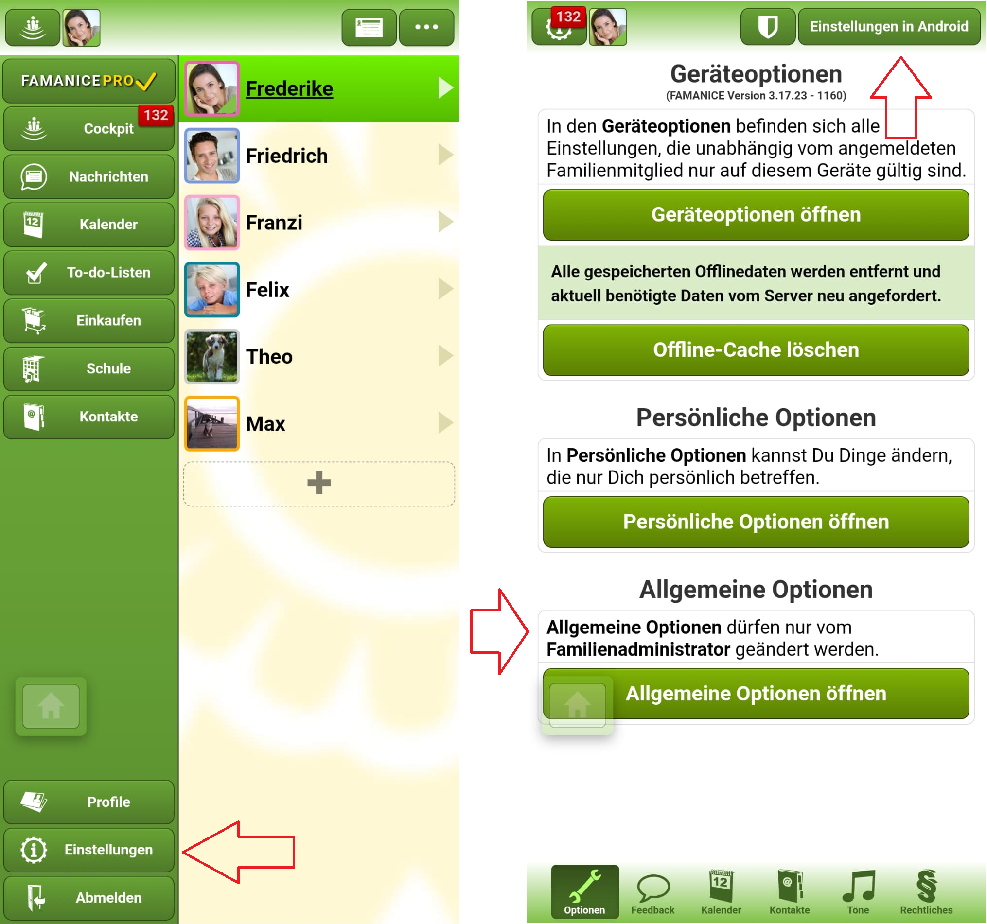 In der FAMANICE-App im Hauptmenü die Einstellungen auswählen und anschließend oben rechts den Button Einstellungen in Android drücken.