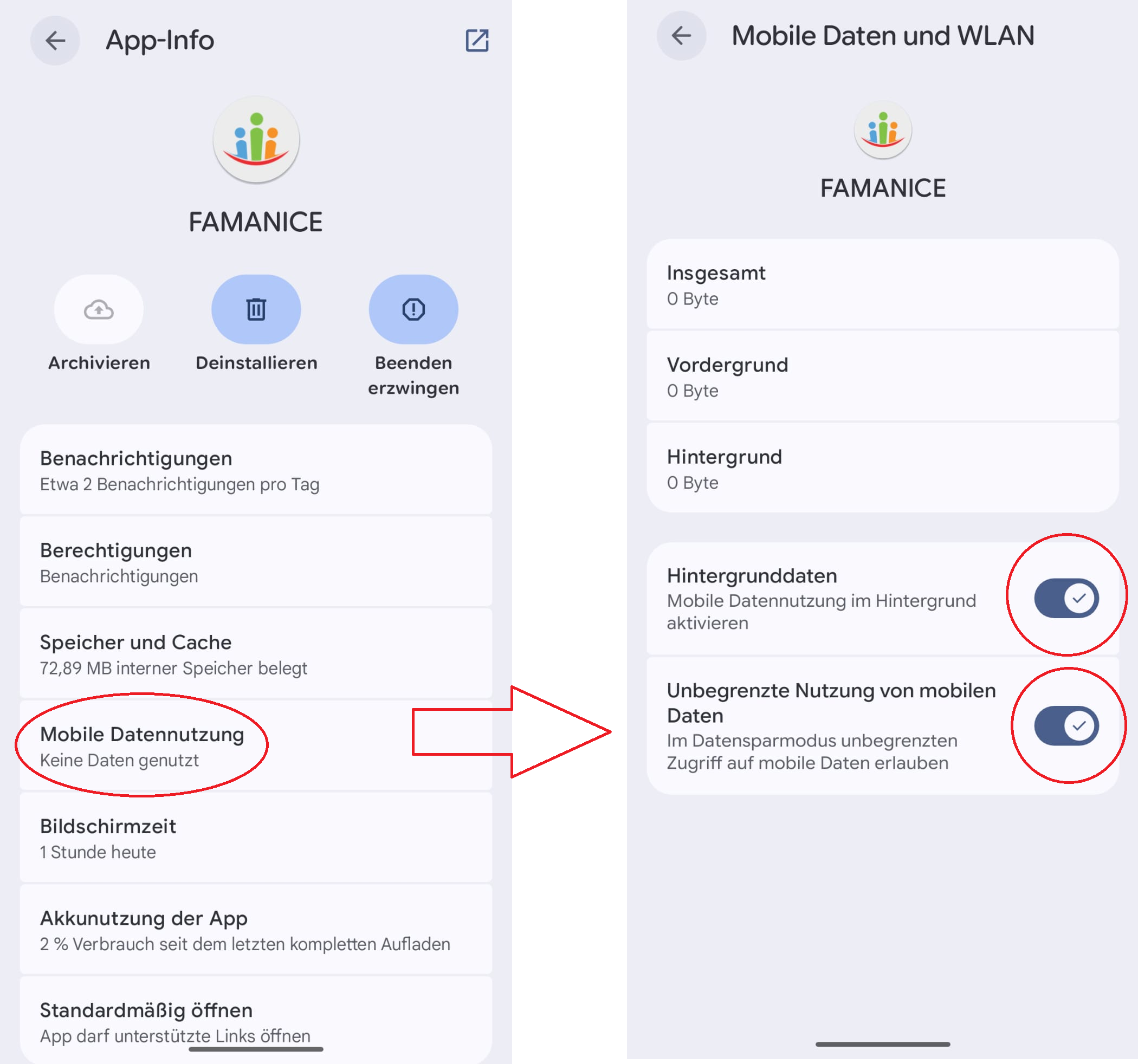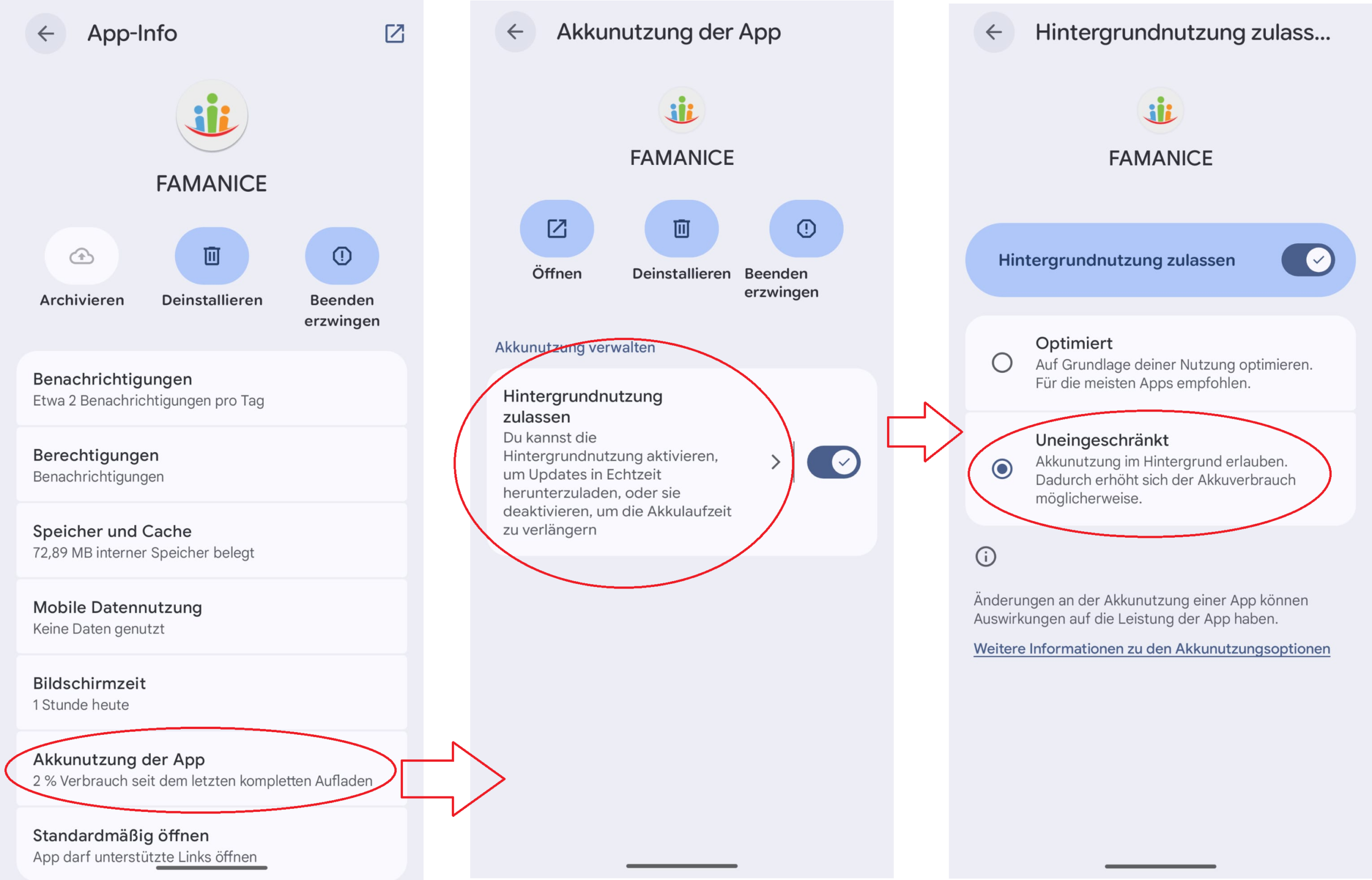 1.) App-Info der FAMANICE-App öffnen